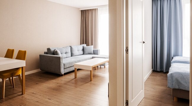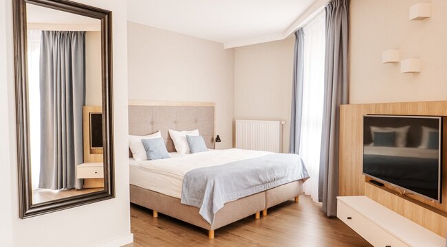 W trosce o jak najwyższy komfort pobytu, oferujemy naszym Gościom przestronne, eleganckie apartamenty z aneksem kuchennym, prywatną łazienką oraz balkonem lub tarasem.